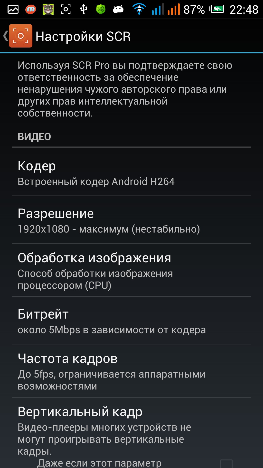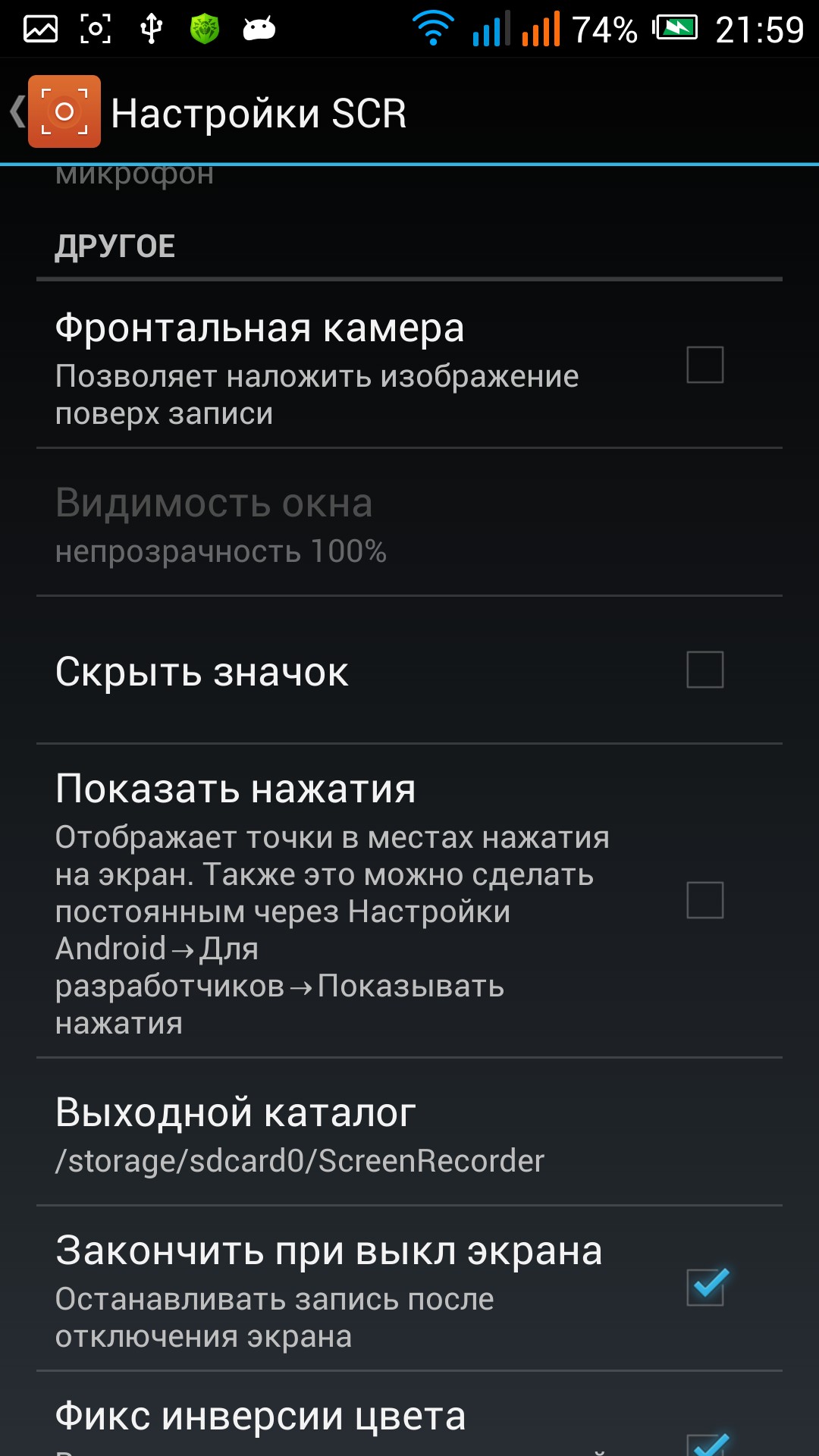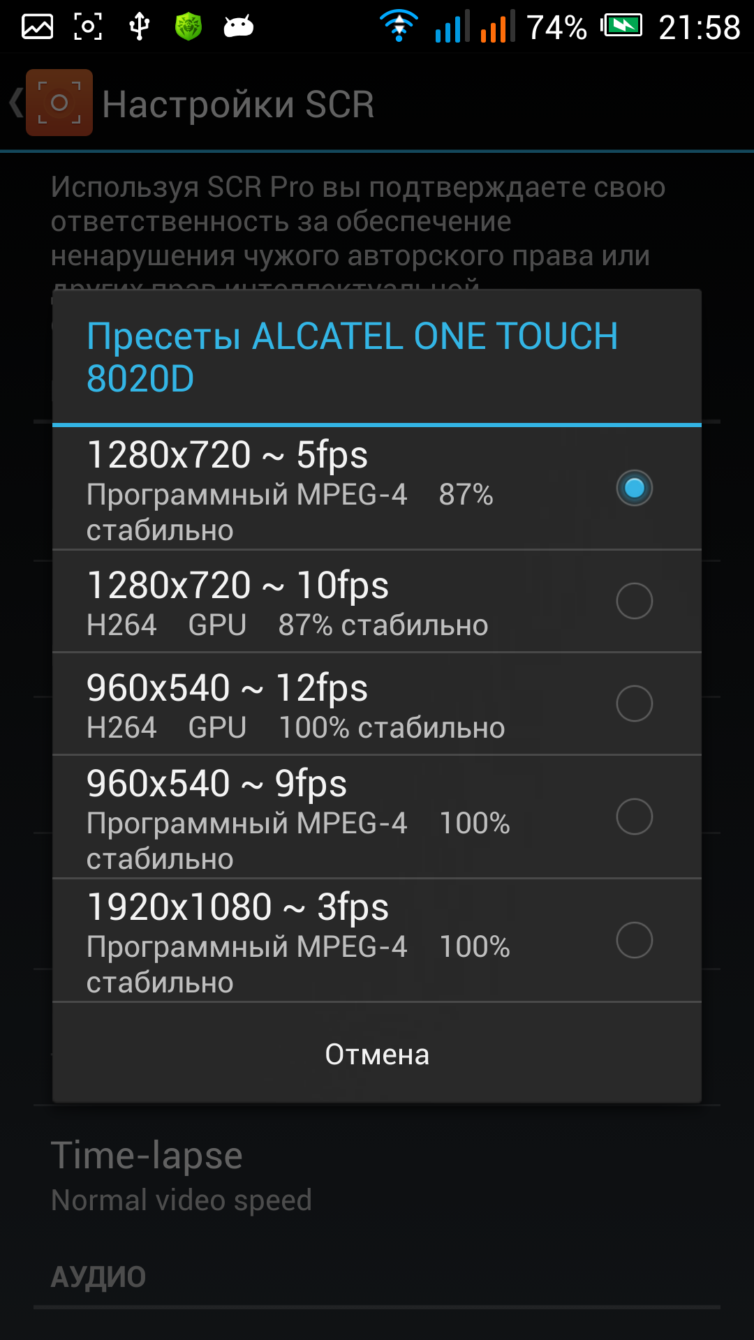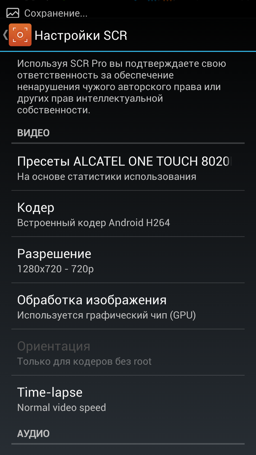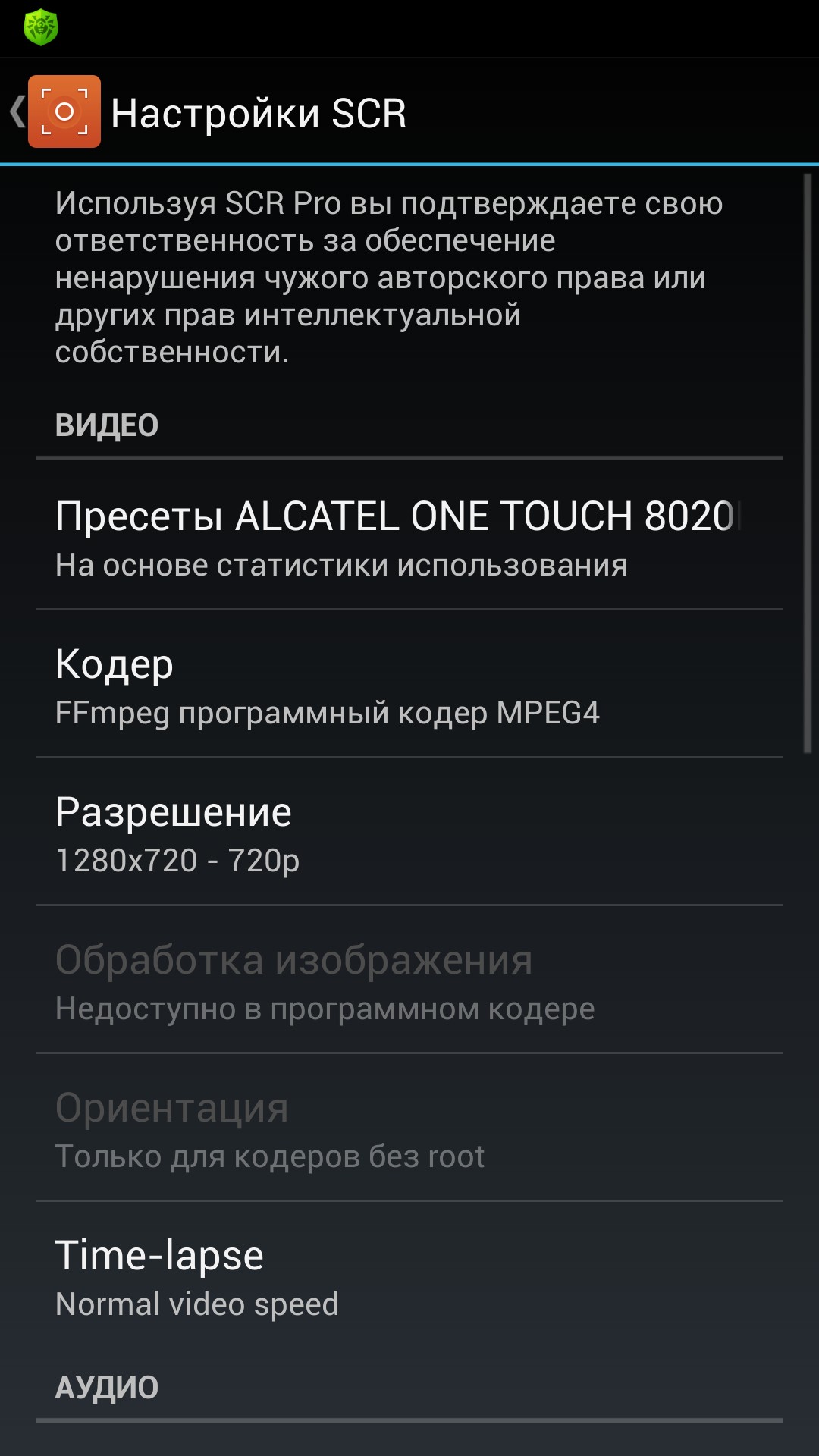 Описание настроек я сделал в видео обзоре к данному приложению, так же как и принцип работы программы. Могу сказать точно что версии 0.14.2-beta и 0.21.5-alpha работают отлично (проверил на своем алкателе). Сам работал с старой версией, но в новой появился интересный пункт Прессеты, в котором можно одним нажатием выбрать наиболее подходящую и оптимальную настройку для записи видео с экрана. Остальные изменения по сути не так важны. Прилагаю огромное количество скриншотов, которое сделал специально для Вас.