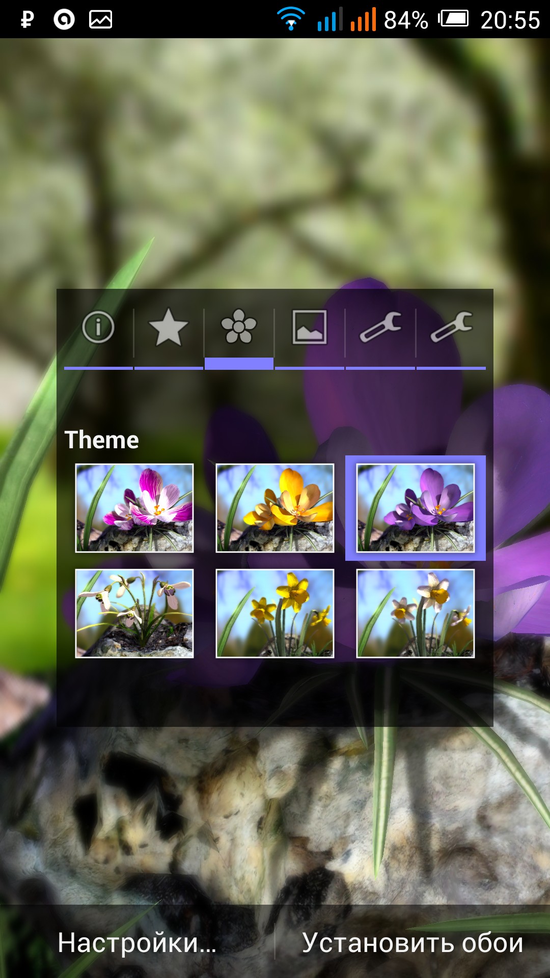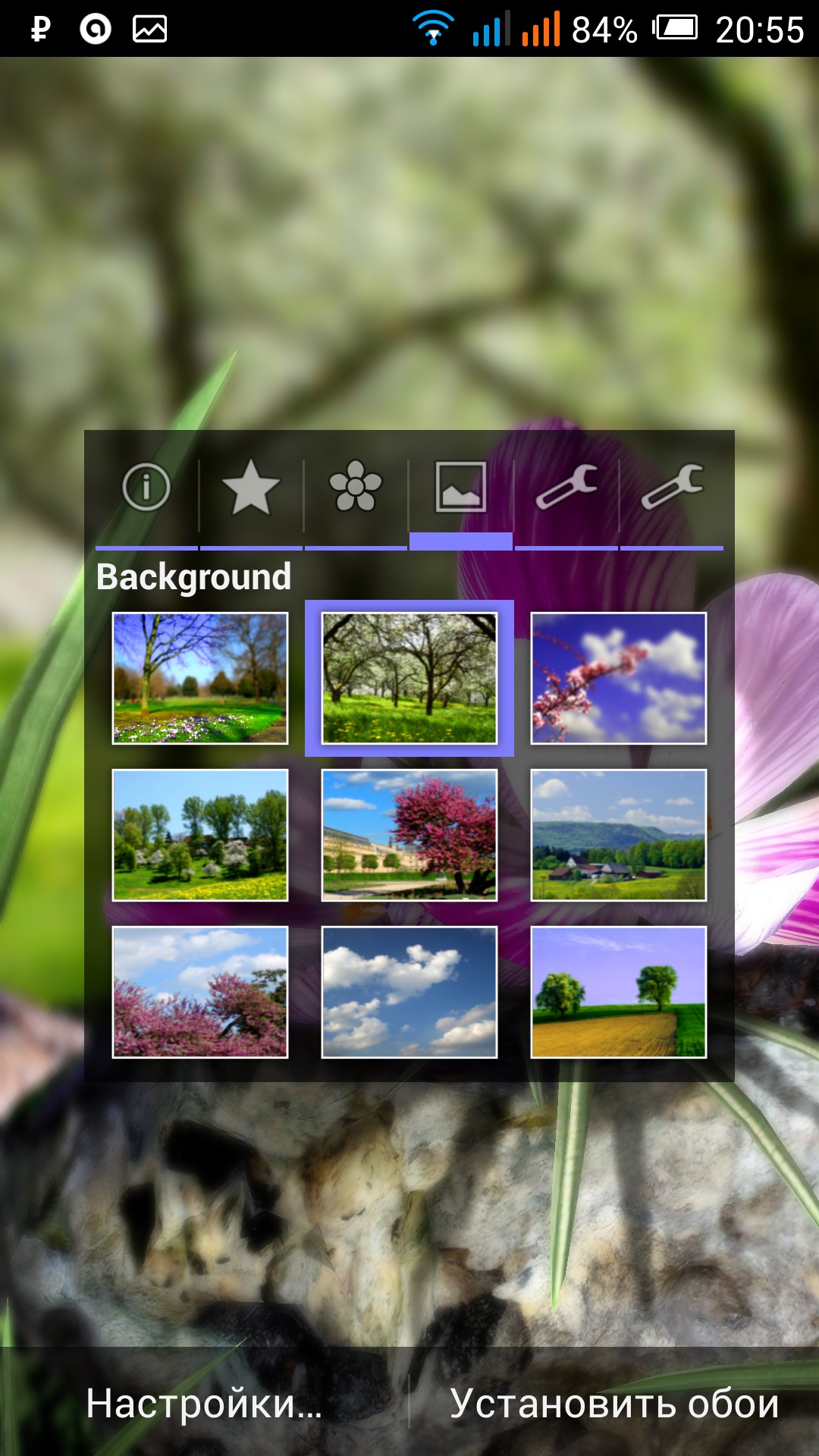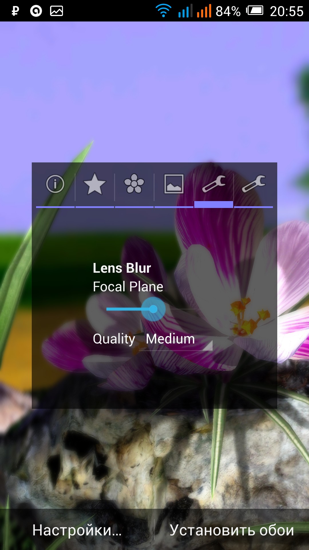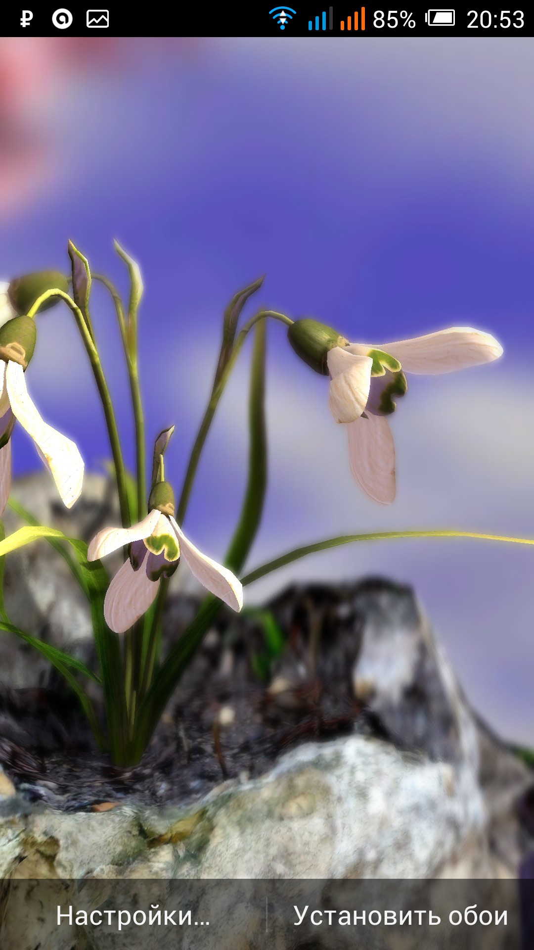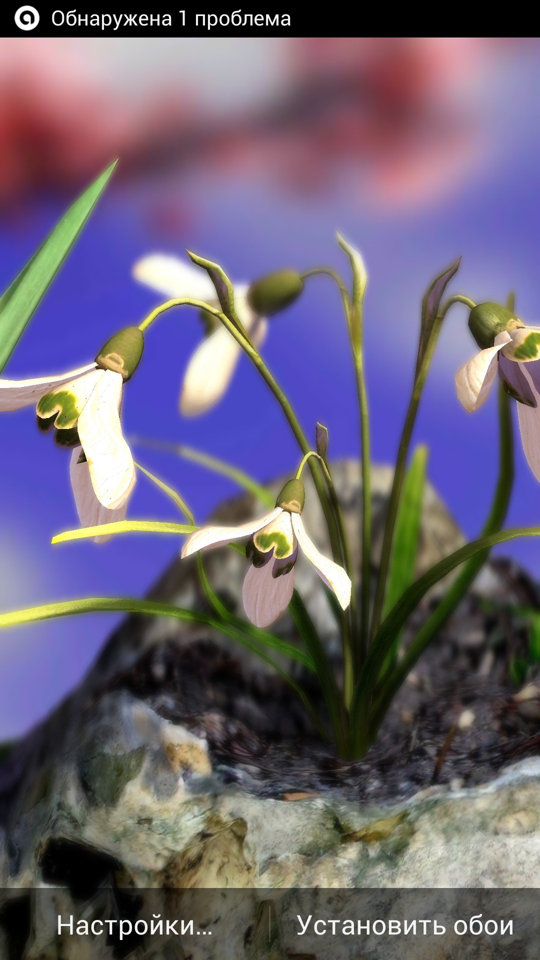 Решил немного посмотреть на варианты предлагаемых живых обоев для ос Андроид и первым мне на глаза попался Nature Live: Spring Flowers XL, который полностью посвящен теме цветов. Могу сказать что разработчик очень хорошо постарался над своим детищем и сделал отличные 3D обои с возможностью выбора одного из шести красивых цветков, а так же фонов, на которых он будет расти у Вас на экране. В настройках обоев можно отрегулировать степень размытости изображения цветка, а так же резкость реагирования поворота изображения от работы гироскопа. Могу сказать что при разрешении экрана 1920 х 1080 картинка смотрится просто изумительно, а качество Вы можете сами проверить на картинках ниже, которые я сделал специально для Вас.