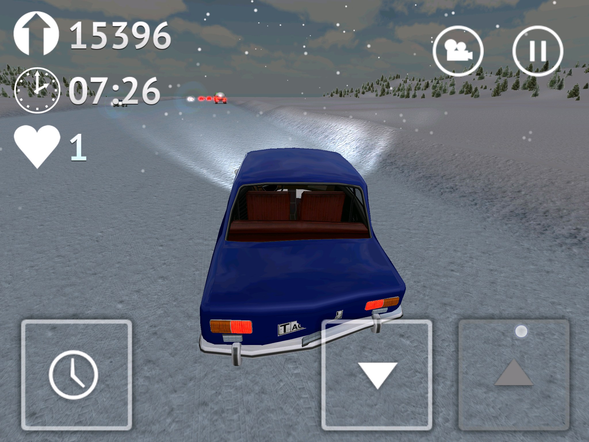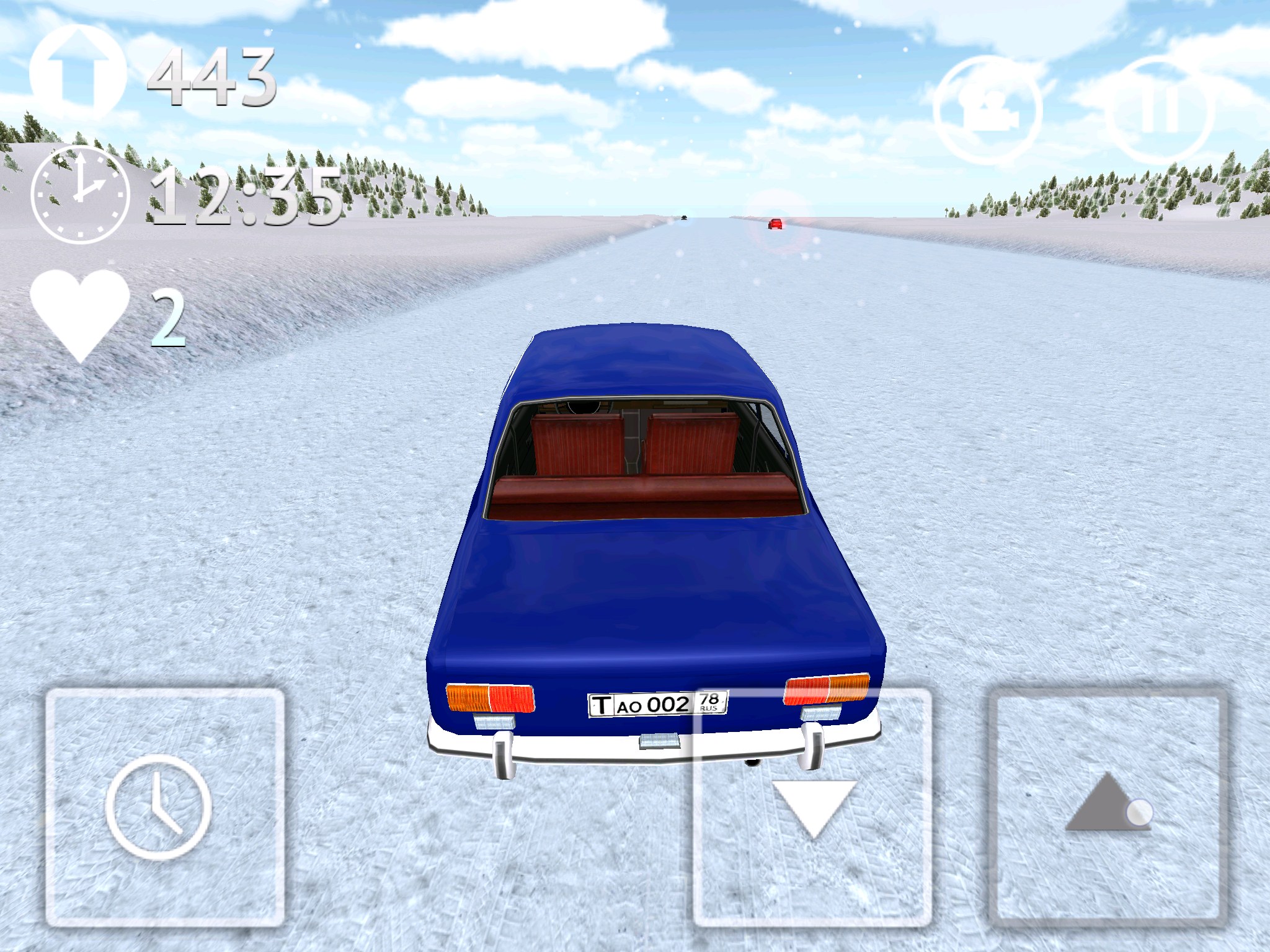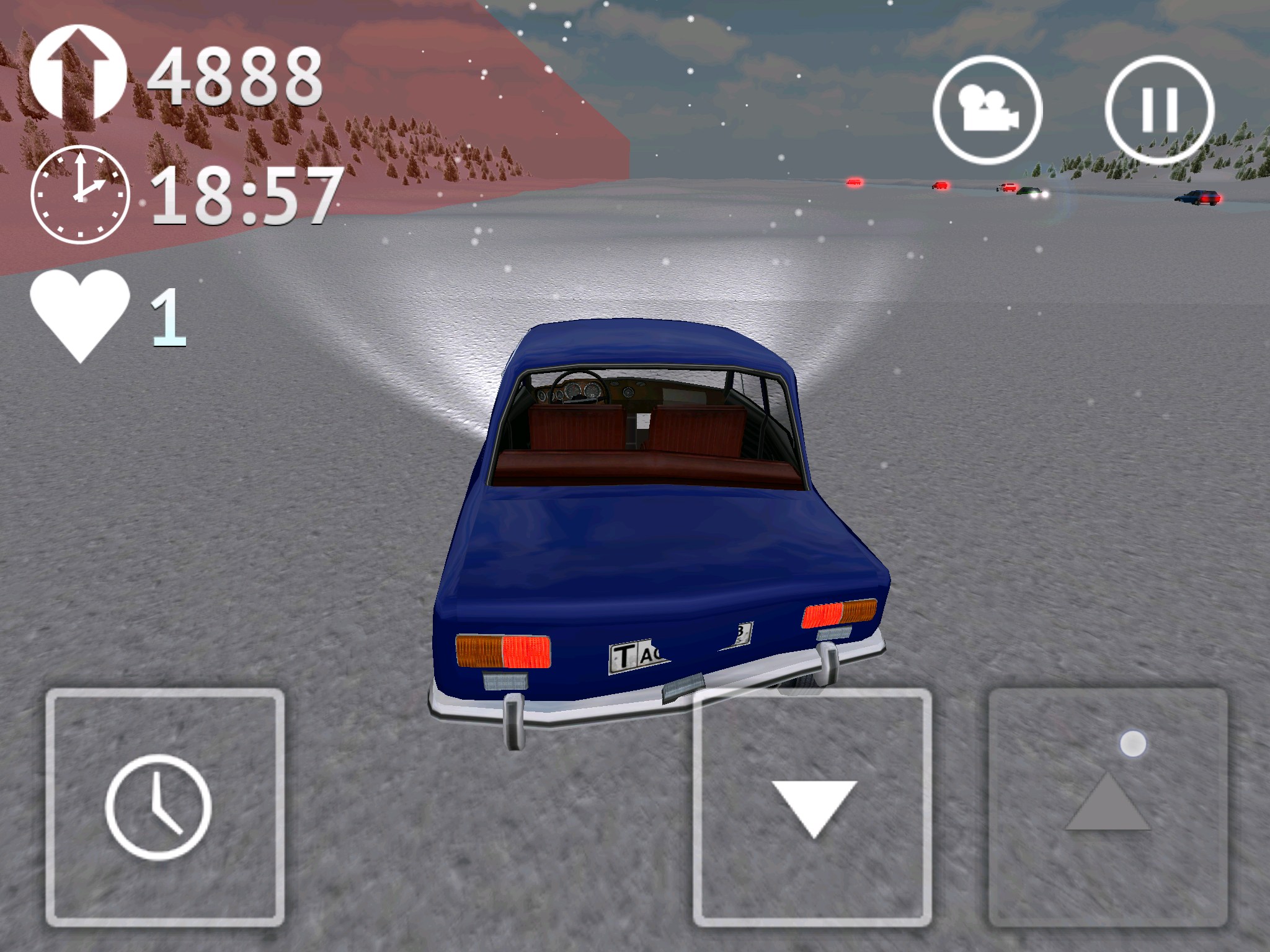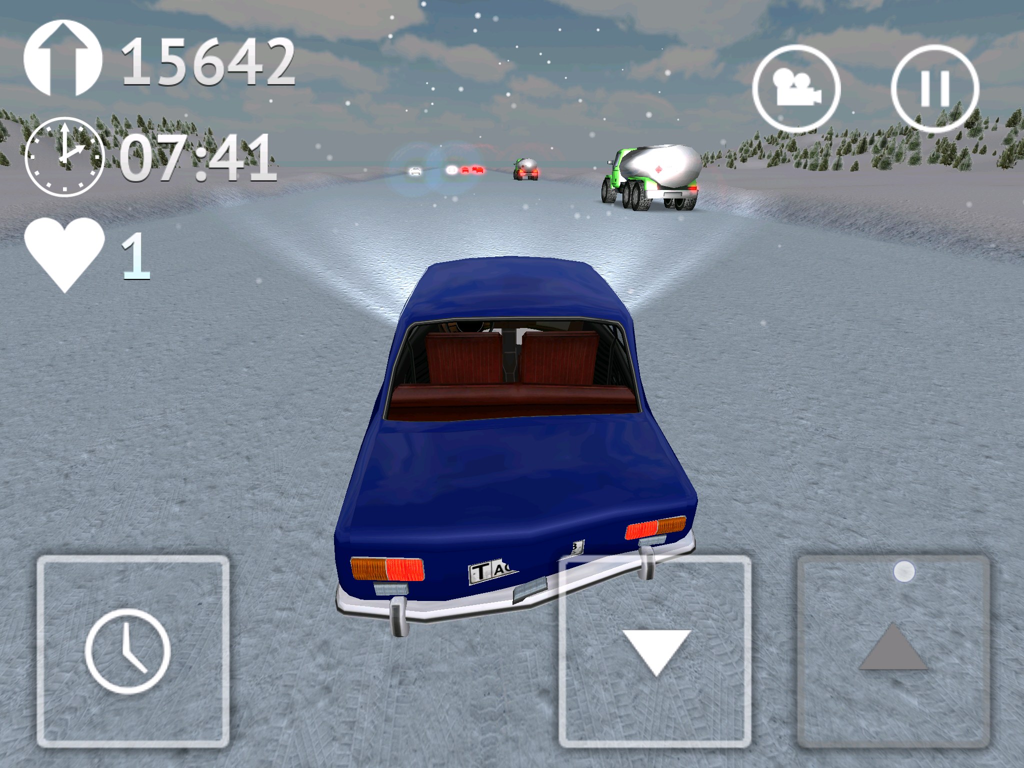 Стоит сказать и о интересной кнопке с иконкой часиков, она позволяет замедлять время. Это может пригодиться при совершении сложных маневров. Есть в игре два вида на трассу: из кабины и от третьего лица (сзади автомобиля). Для открытия автомобилей нужно устанавливать рекорды поездок на трассе. У меня рекорд более 16 000 (что видно на скриншотах), дальше мне просто надоело и я решил попробовать другие авто.
