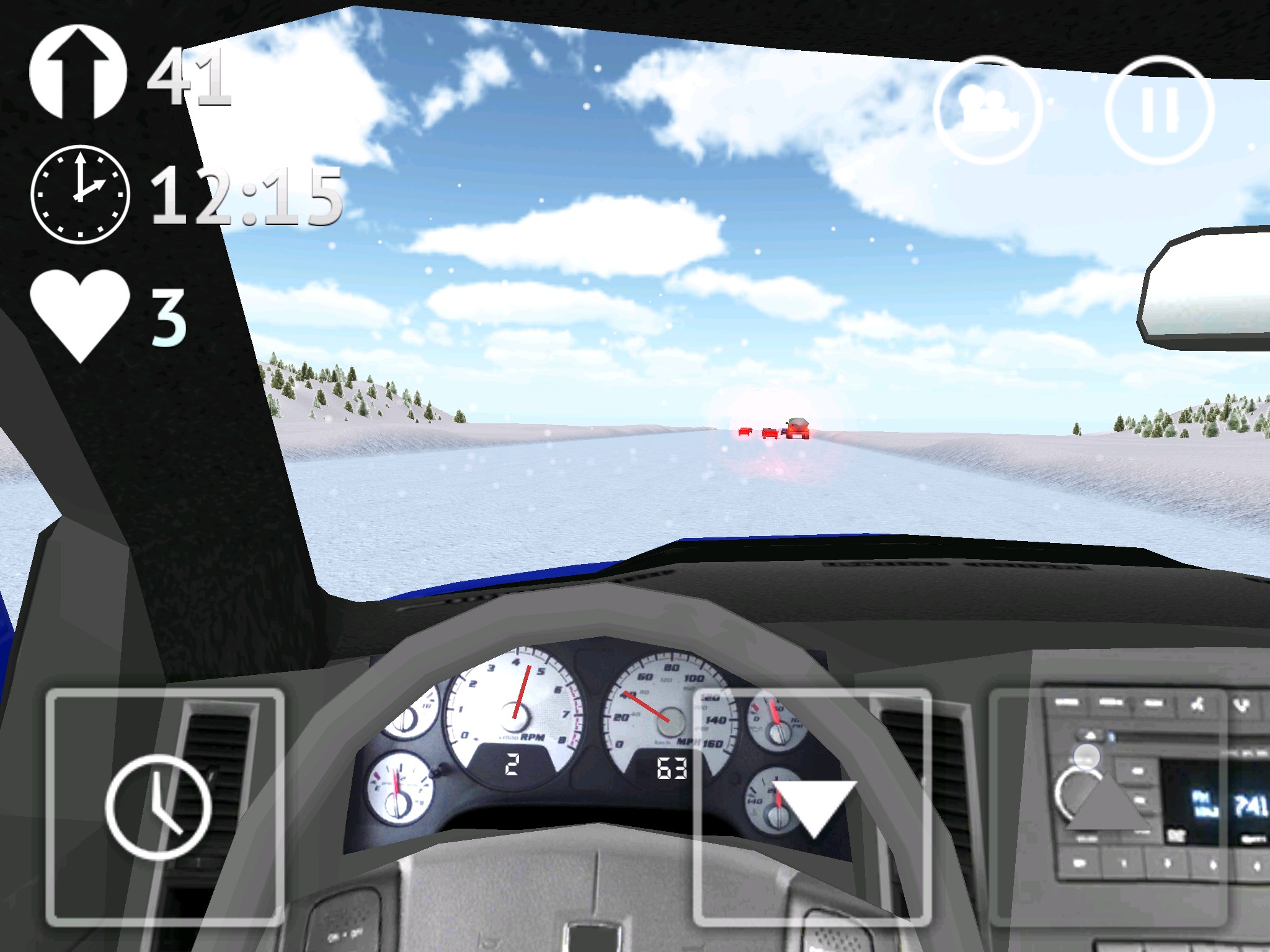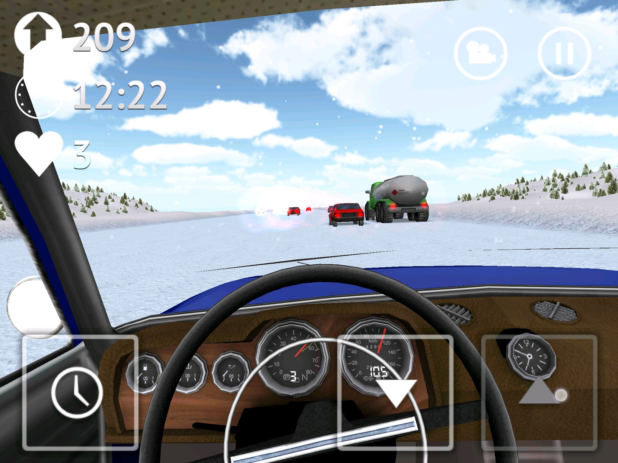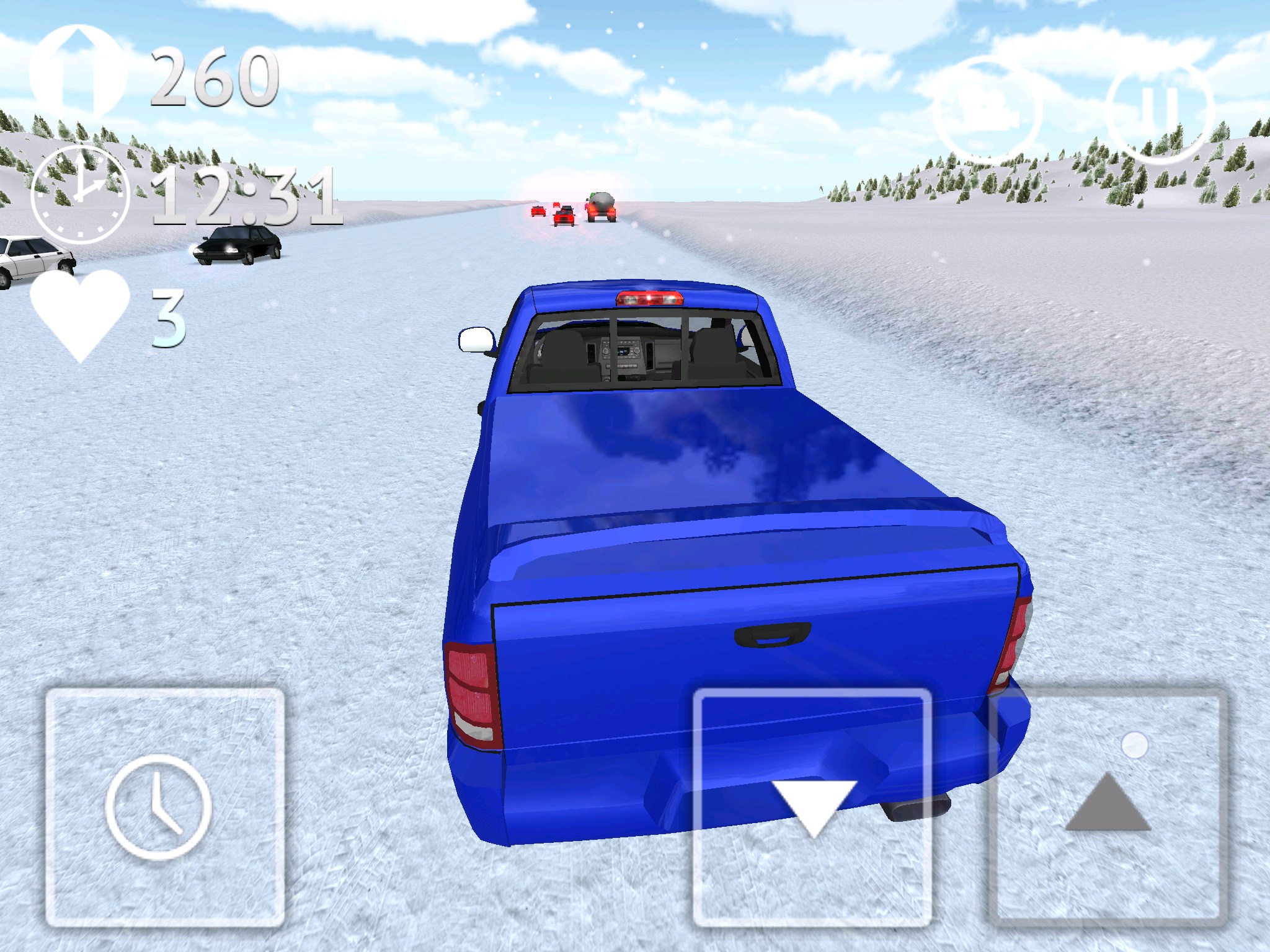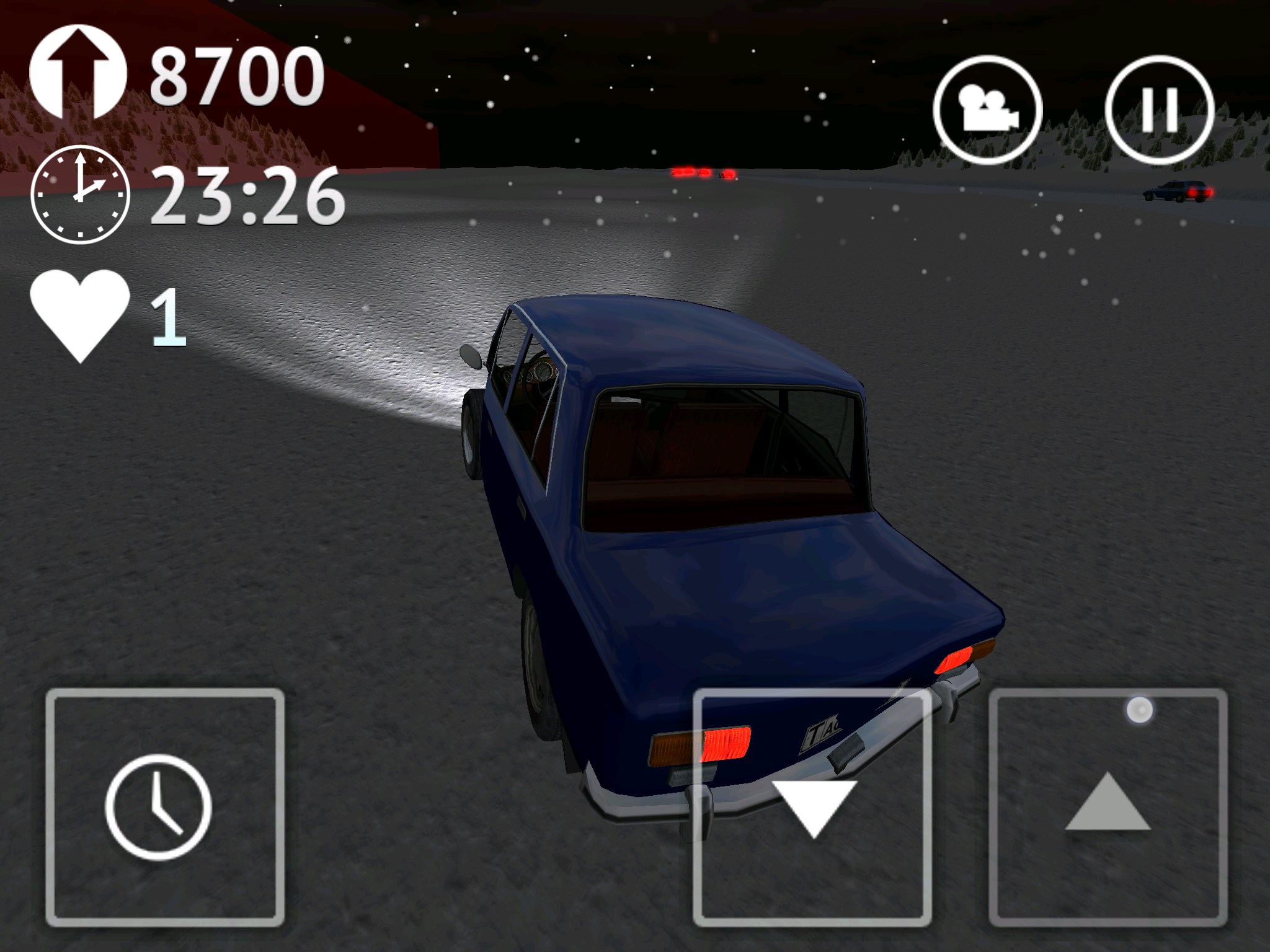Стоит сказать и о интересной кнопке с иконкой часиков, она позволяет замедлять время. Это может пригодиться при совершении сложных маневров. Есть в игре два вида на трассу: из кабины и от третьего лица (сзади автомобиля). Для открытия автомобилей нужно устанавливать рекорды поездок на трассе. У меня рекорд более 16 000 (что видно на скриншотах), дальше мне просто надоело и я решил попробовать другие авто.