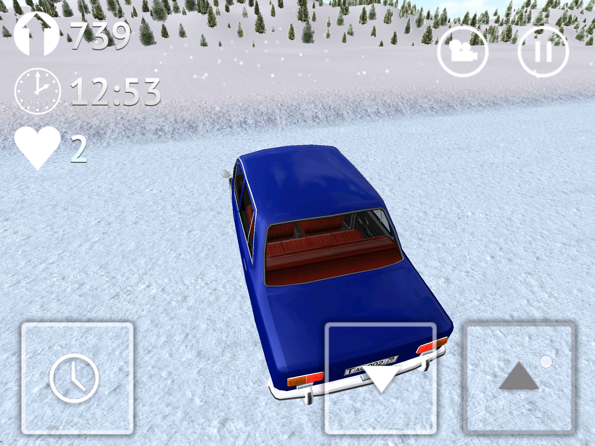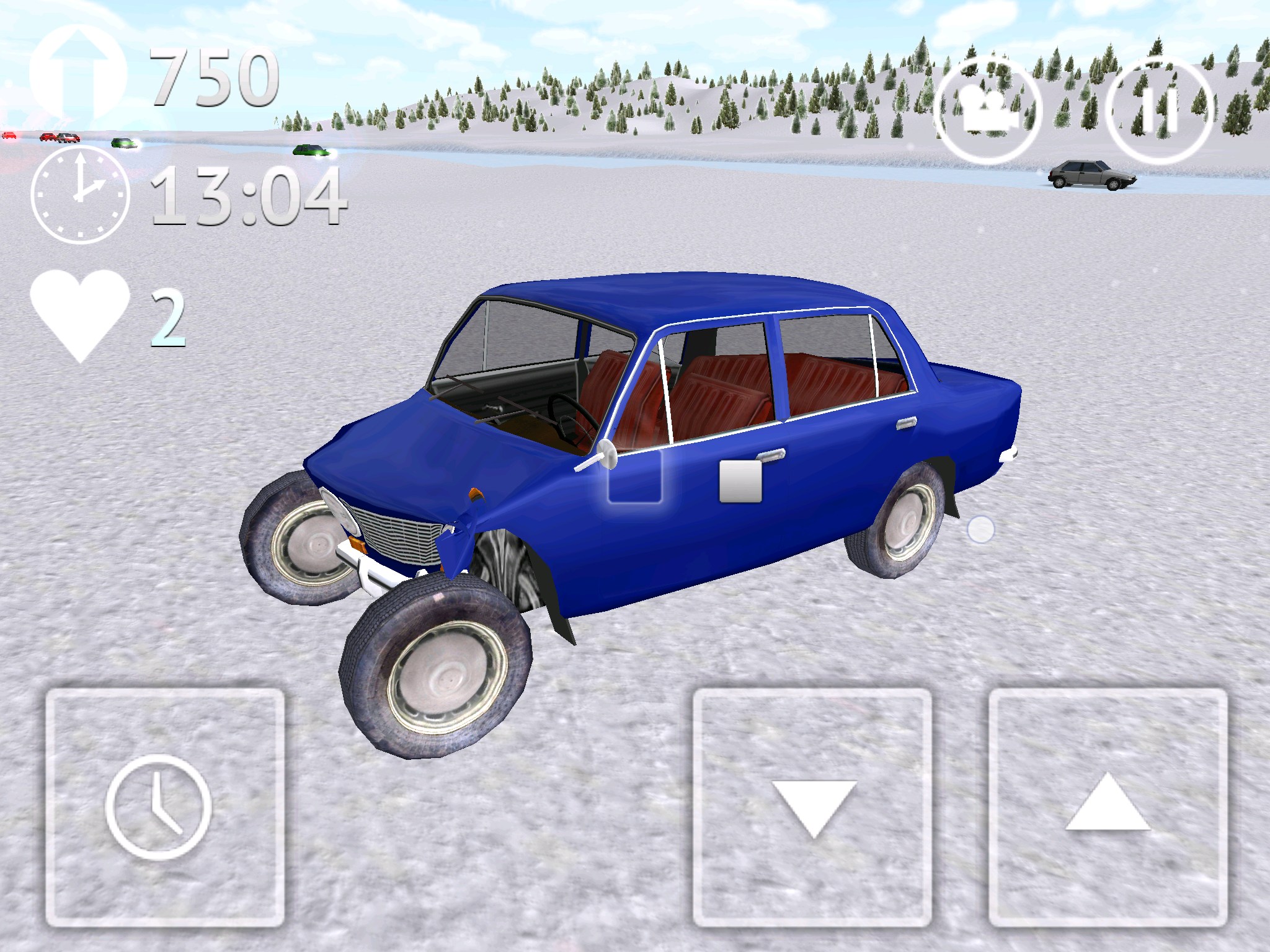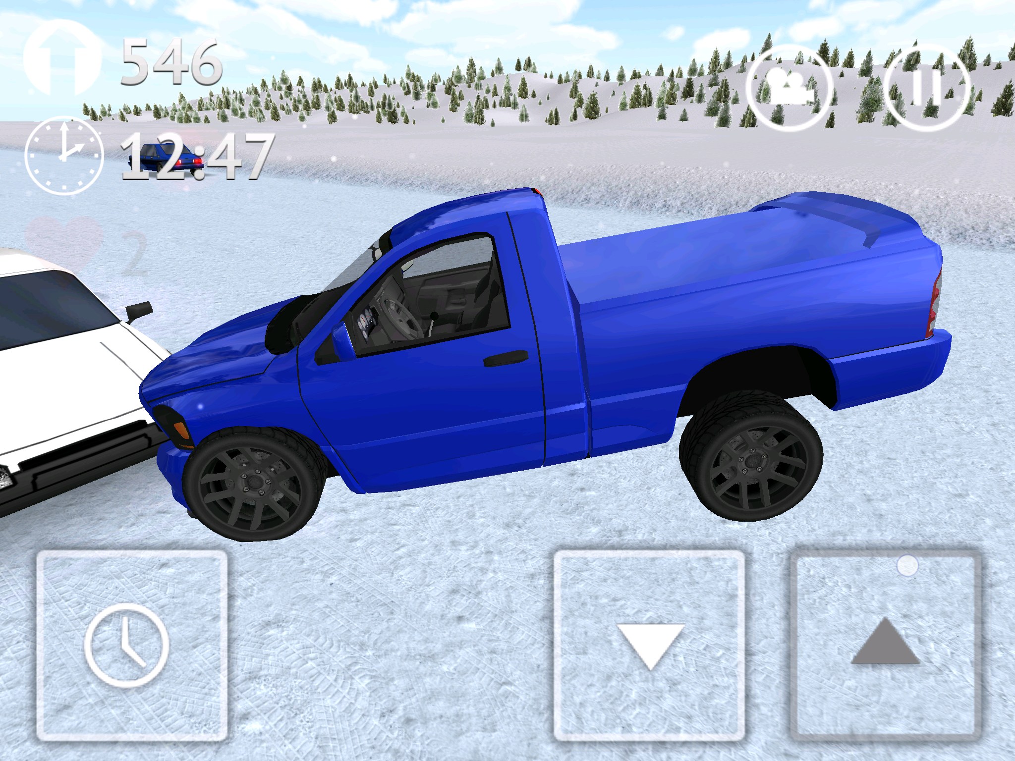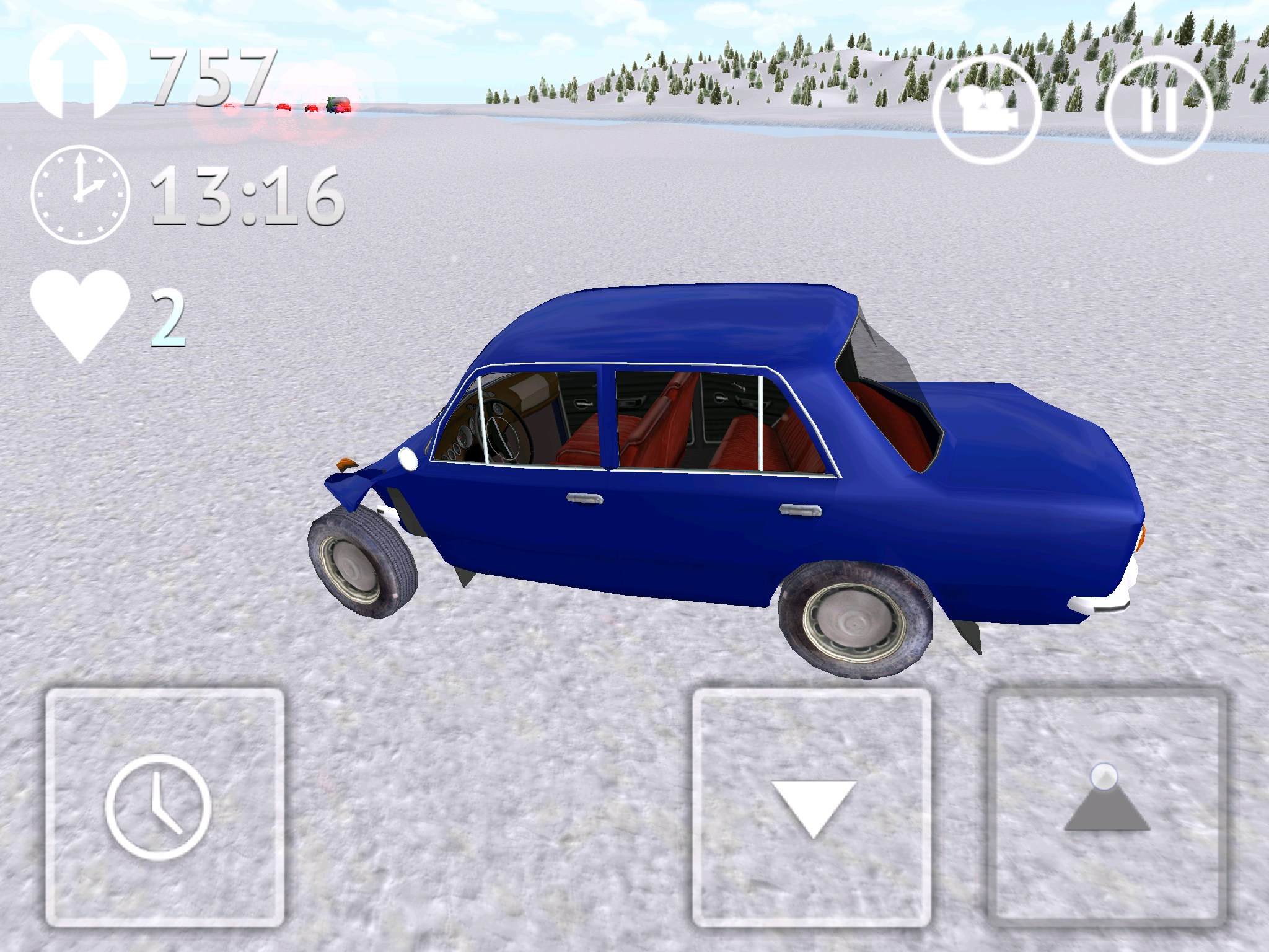 Стоит сказать и о интересной кнопке с иконкой часиков, она позволяет замедлять время. Это может пригодиться при совершении сложных маневров. Есть в игре два вида на трассу: из кабины и от третьего лица (сзади автомобиля). Для открытия автомобилей нужно устанавливать рекорды поездок на трассе. У меня рекорд более 16 000 (что видно на скриншотах), дальше мне просто надоело и я решил попробовать другие авто.