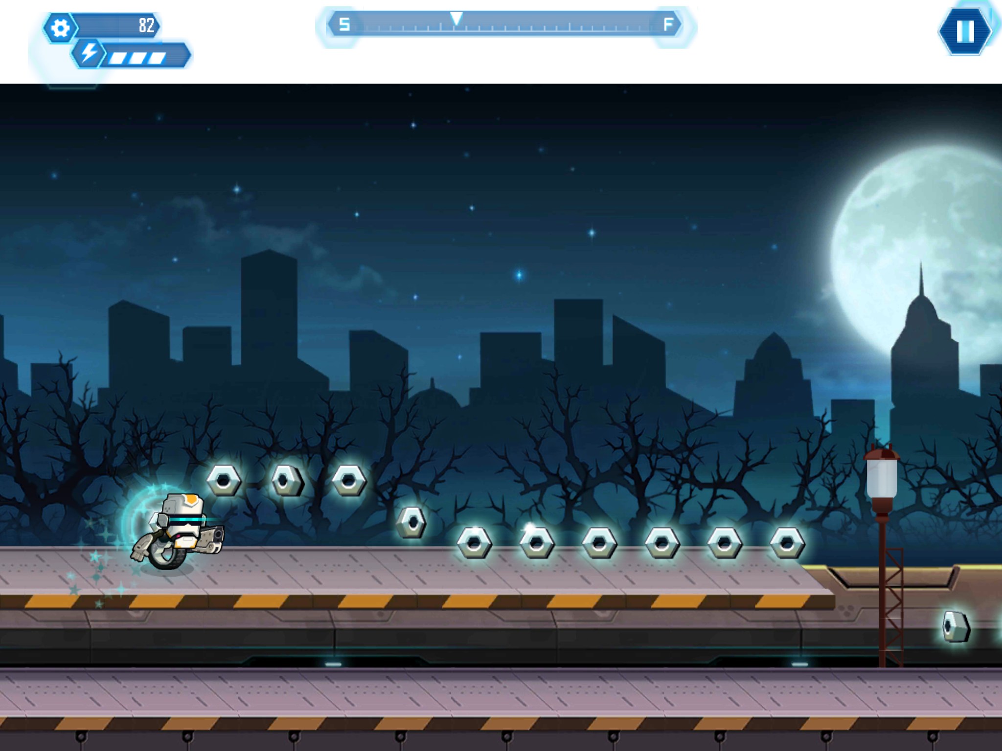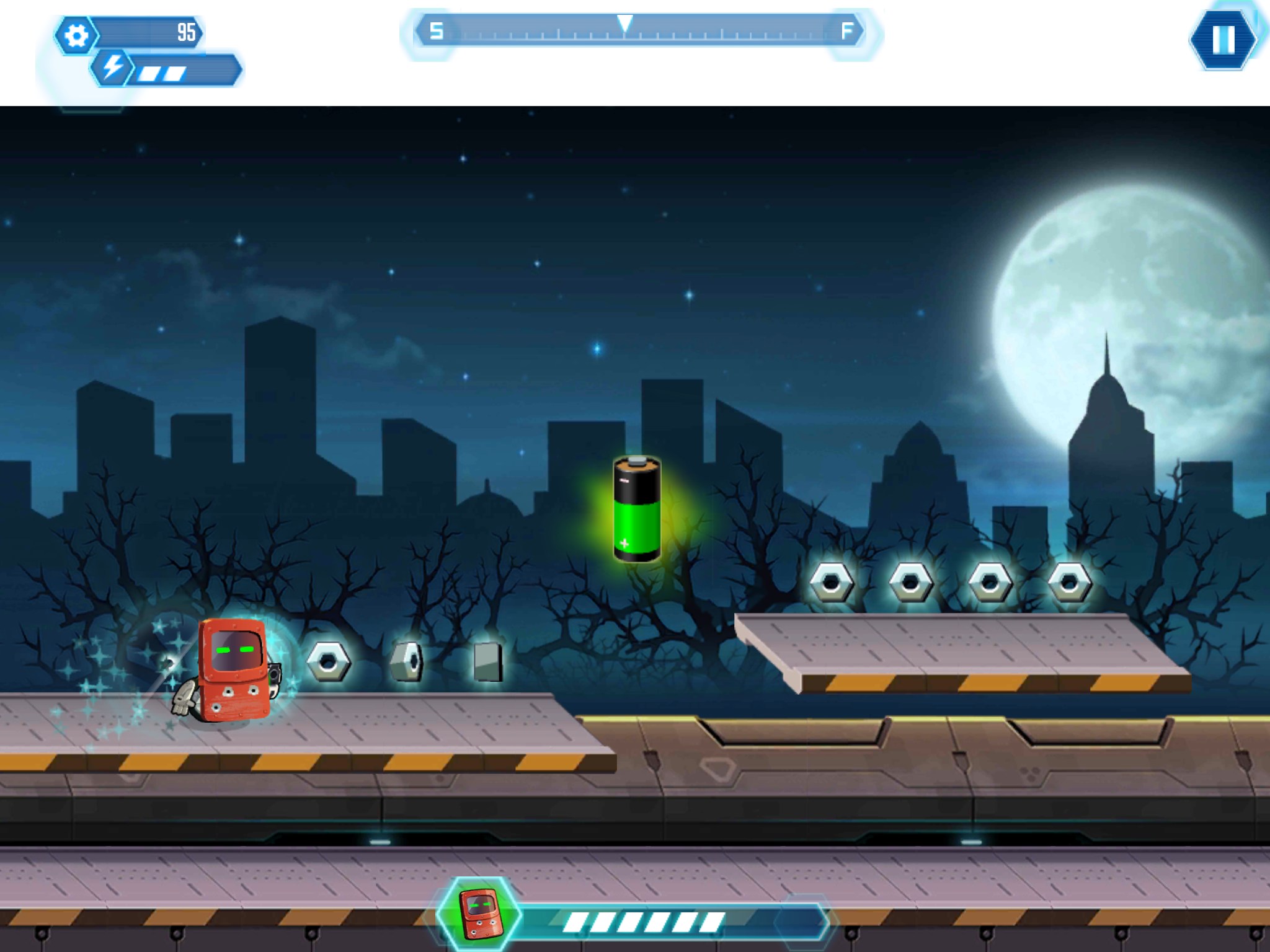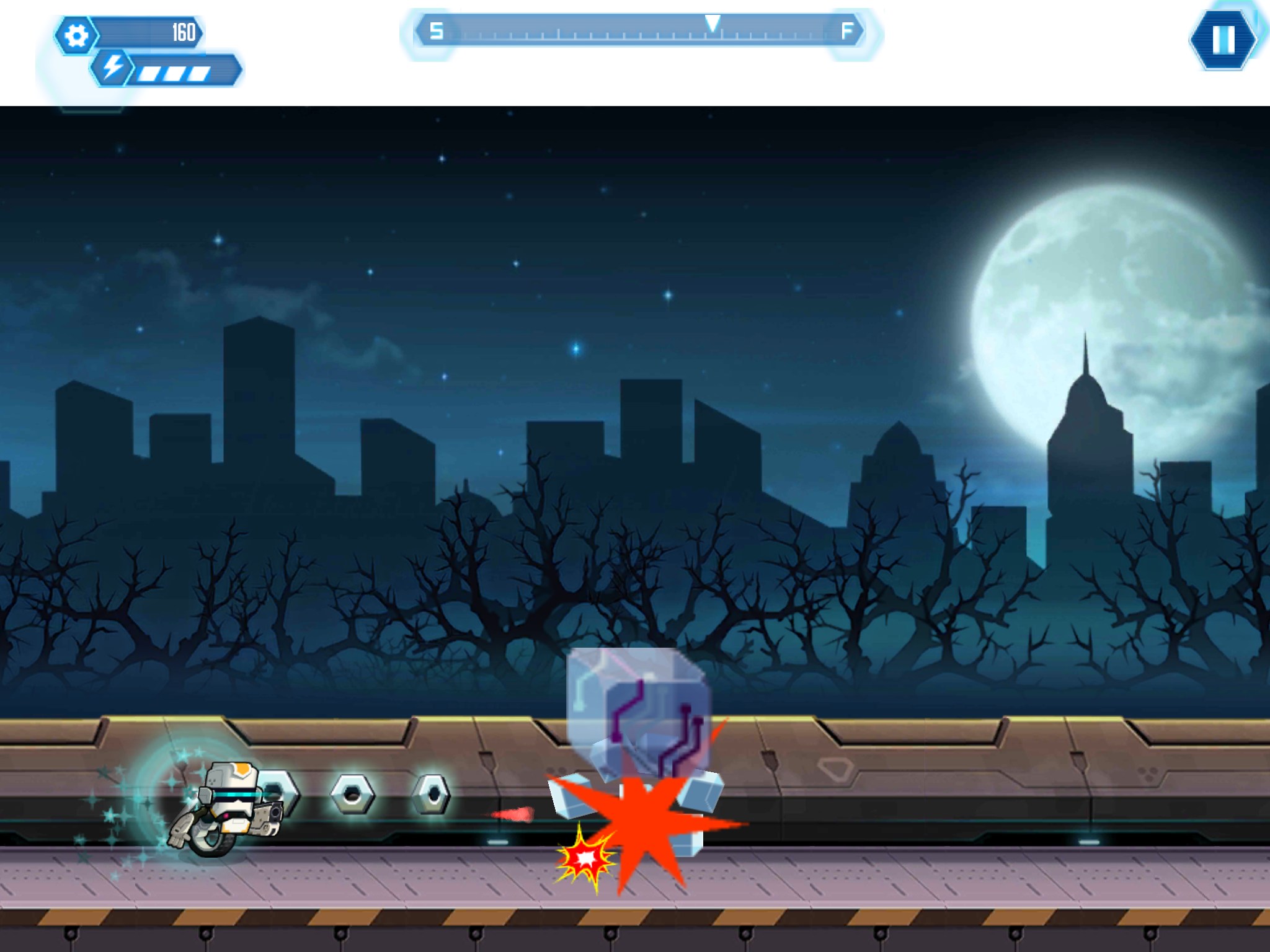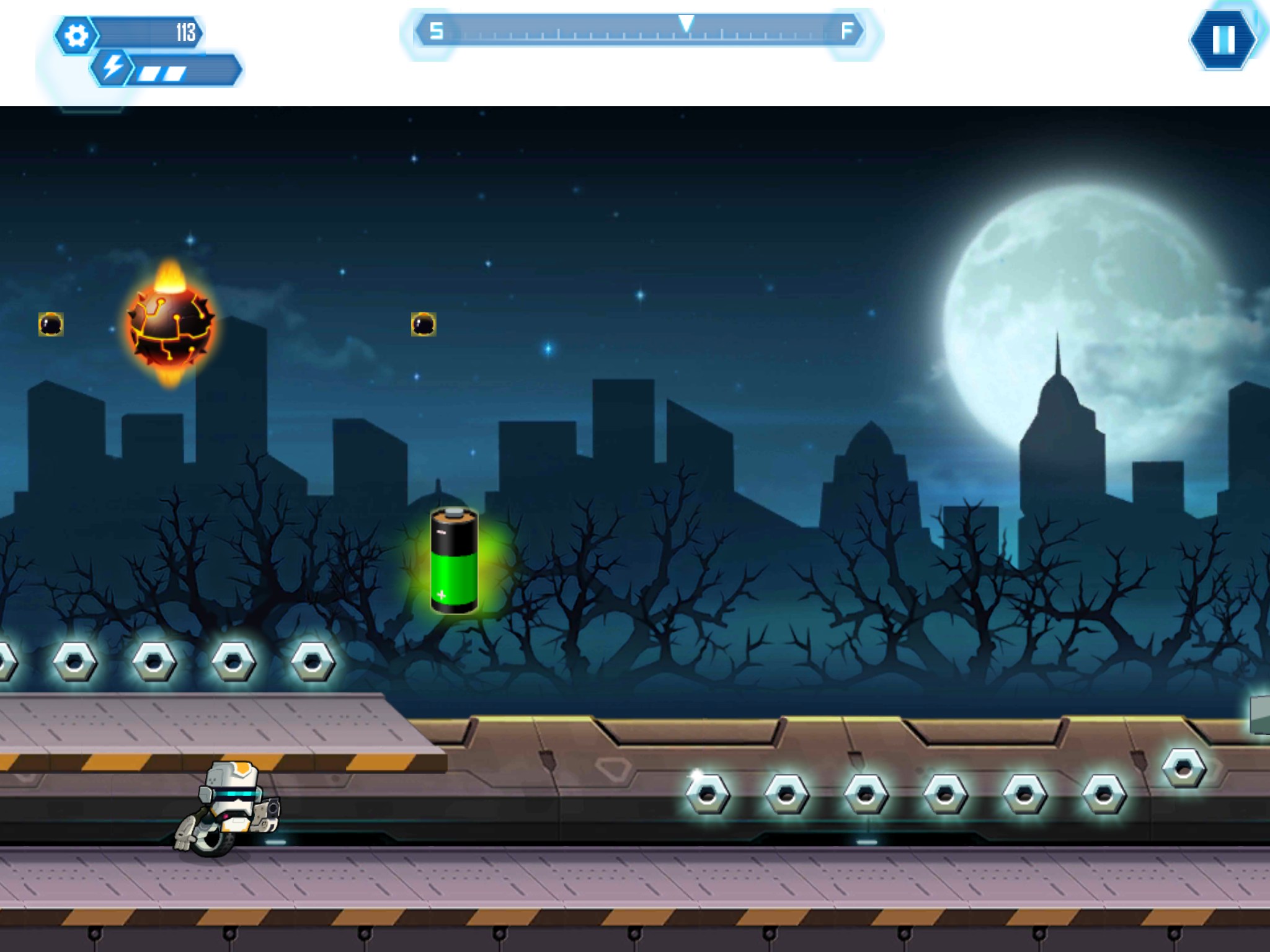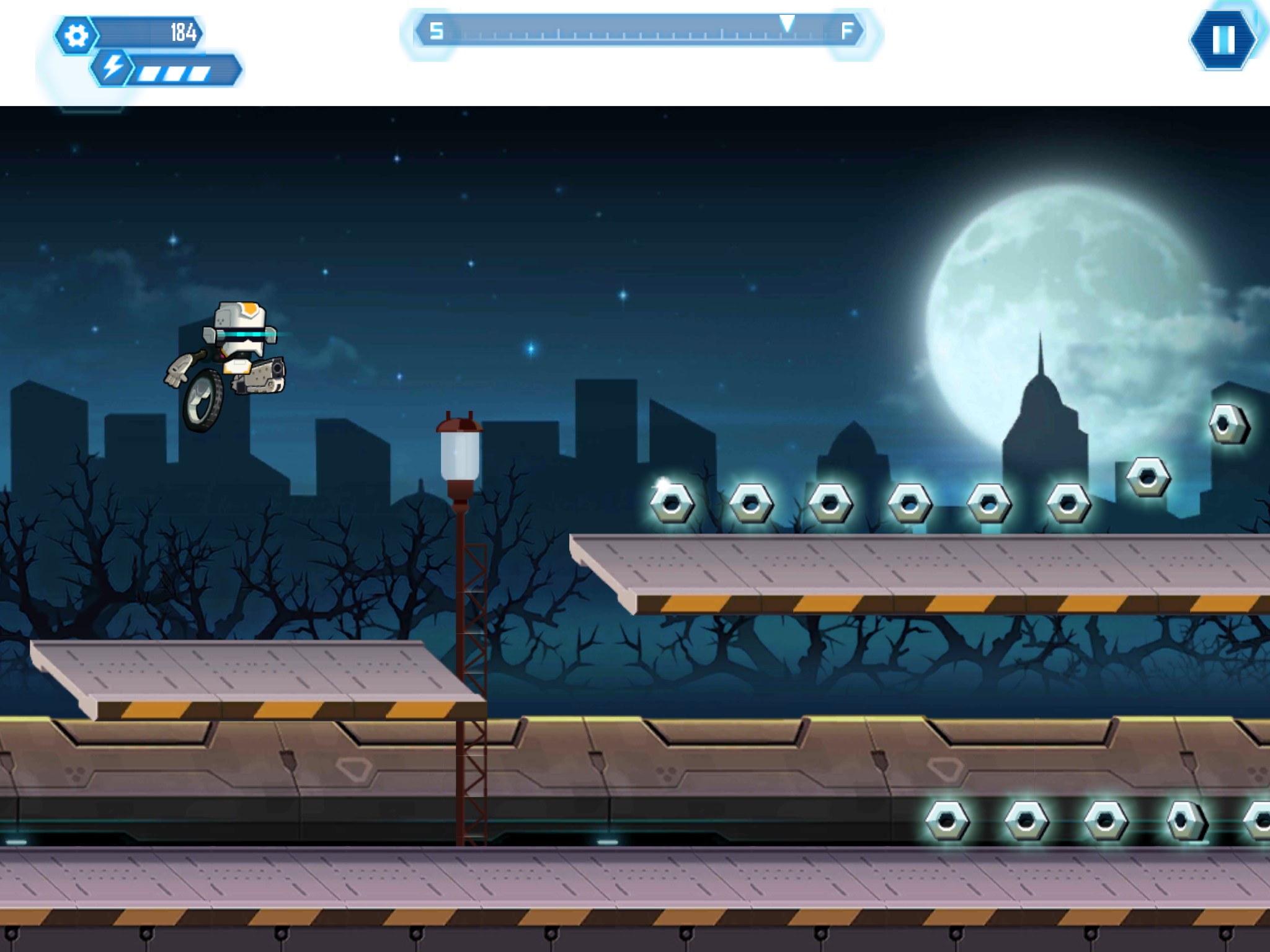 Совершенно случайно обнаружил эту игру в гугл плей и решил ее попробовать, так как отзывы были вполне не плохие. Игра RUN-NY на самом деле оказалась весьма не плохой на мой взгляд и вполне оправдывает положительные оценки. Ваша задача в данной игрушке управлять роботом, который едет на колесе по разным локациям и выполняет поставленные задачи. Список задач обычно показывается перед началом уровней. Управление в игре довольно элементарное, робот постоянно движется вперед и Вам остается только прыгать, коснувшись экрана (а если коснуться два раза, то робот совершит двойной прыжок). При тапании по ящику — будет произведен выстрел, если Вы от него на далекой дистанции. Картинки к игре смотрите чуть ниже.
