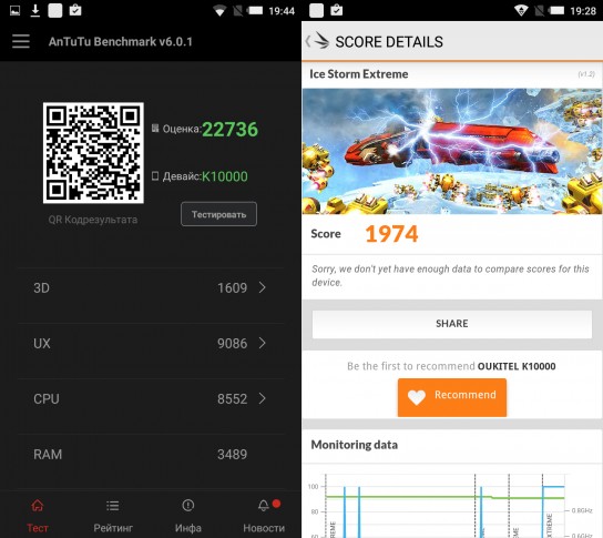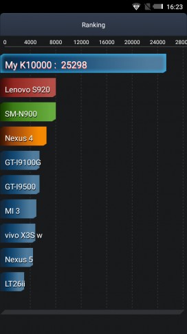 Напомним, что в смартфоне Oukitel K10000 установлен несъемный аккумулятор, и по заявлениям производителя его емкость составляет 10 000 мАч. В тесте аккумулятора с помощью программы AnTuTu Battery Test с разрядом на 80% смартфон набрал более 25-ти тысяч баллов. По этому показателю смартфон Oukitel K10000 является лидирующим среди всех смартфонов, когда-либо тестировавшихся нами.
