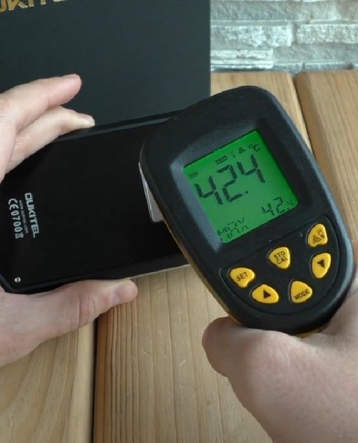 Далее мы тестировали смартфон на нагрев. Для этого мы обычно используем игру Асфальт 8. Установили средние настройки изображения, игру по сети и поехали. На средних настройках изображения смартфон Oukitel K10000 справляется с данной игрой без каких-либо проблем. Что касается нагрева корпуса после 10 минут игры, то он был едва заметен. В самой горячей точке температура едва ли достигла 42°C, и это очень приятная новость.