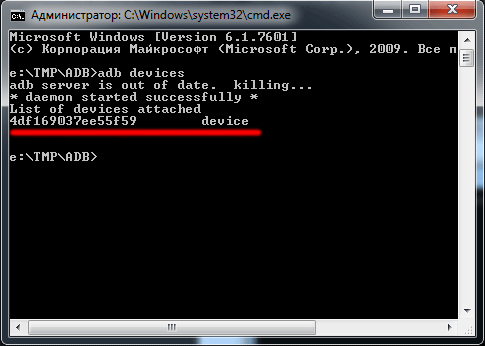 Если же Вы видите что то похожее на картинке ниже, т.е. под надписью List of devices attached есть еще одна строка с надписью типа «4df169037ee55f59        device«, то значит ADB драйвера установлены, компьютер видит подключенное устройство и пункт 4 Вам можно пропускать.