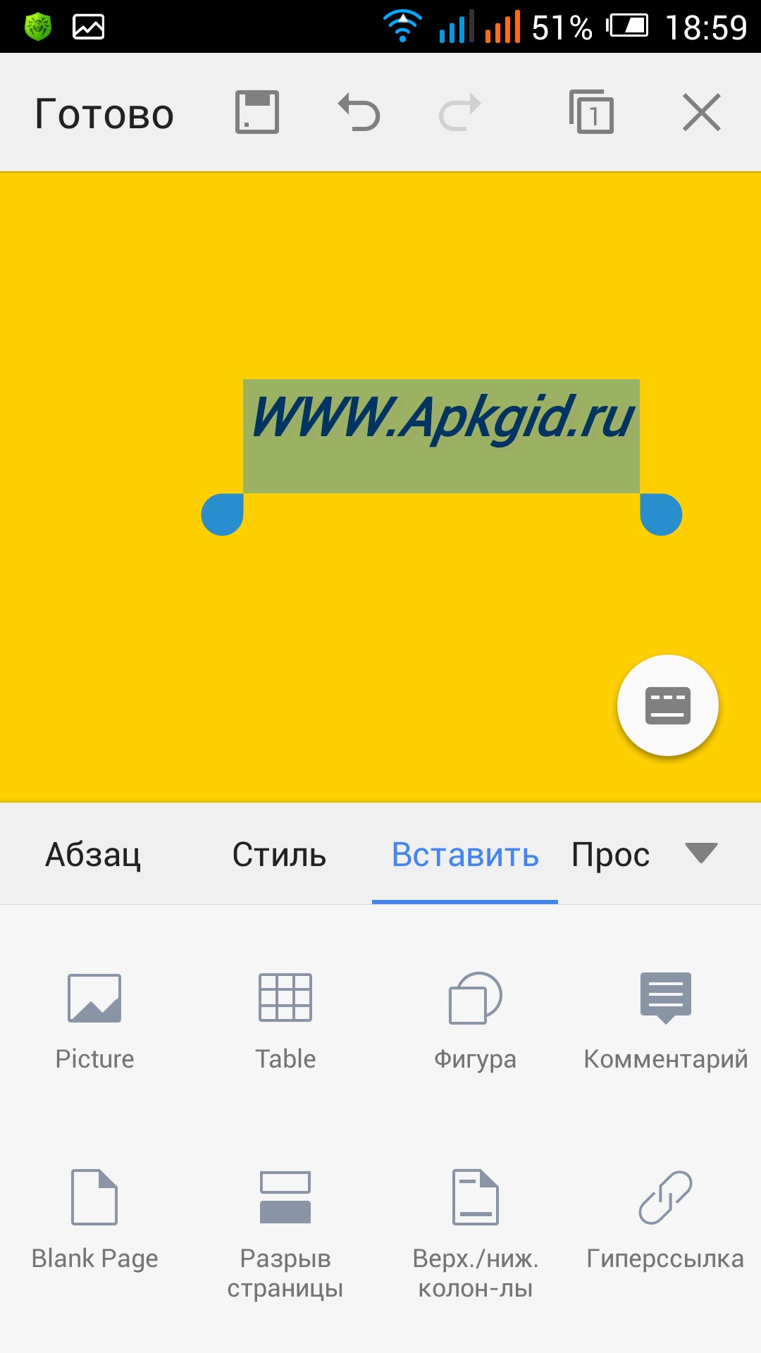 В нижней части находятся все инструменты редактирования документов. Нужно всего лишь нажать на иконку с четырьмя квадратиками и открывается полный набор, который разделен на категории (шрифт, страница и так далее), в каждой из категорий есть свои инструменты для правки. Все что я пишу свойственно всем возможным создаваемым документам в данном приложении. В зависимости от запущенного пакета будут добавляться те или иные функции в эти инструменты. Например в приложении Таблицы Вы можете заметить пункты построение диаграмм, работы с ячейками и так далее, которые свойственны только Таблицам.
